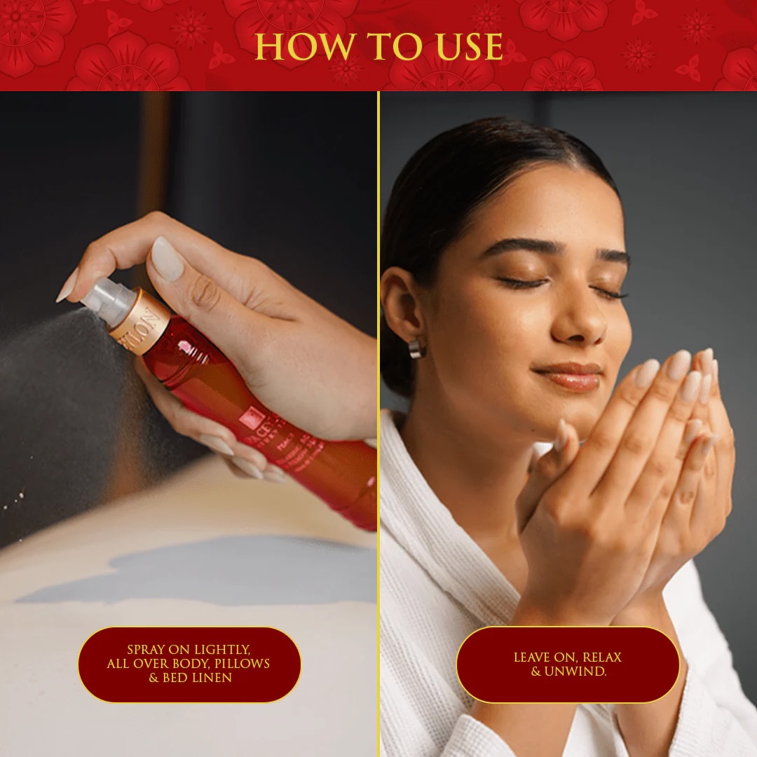 After bath, spray on lightly all over body, pillows & bed linen. Leave on. Relax & unwind.