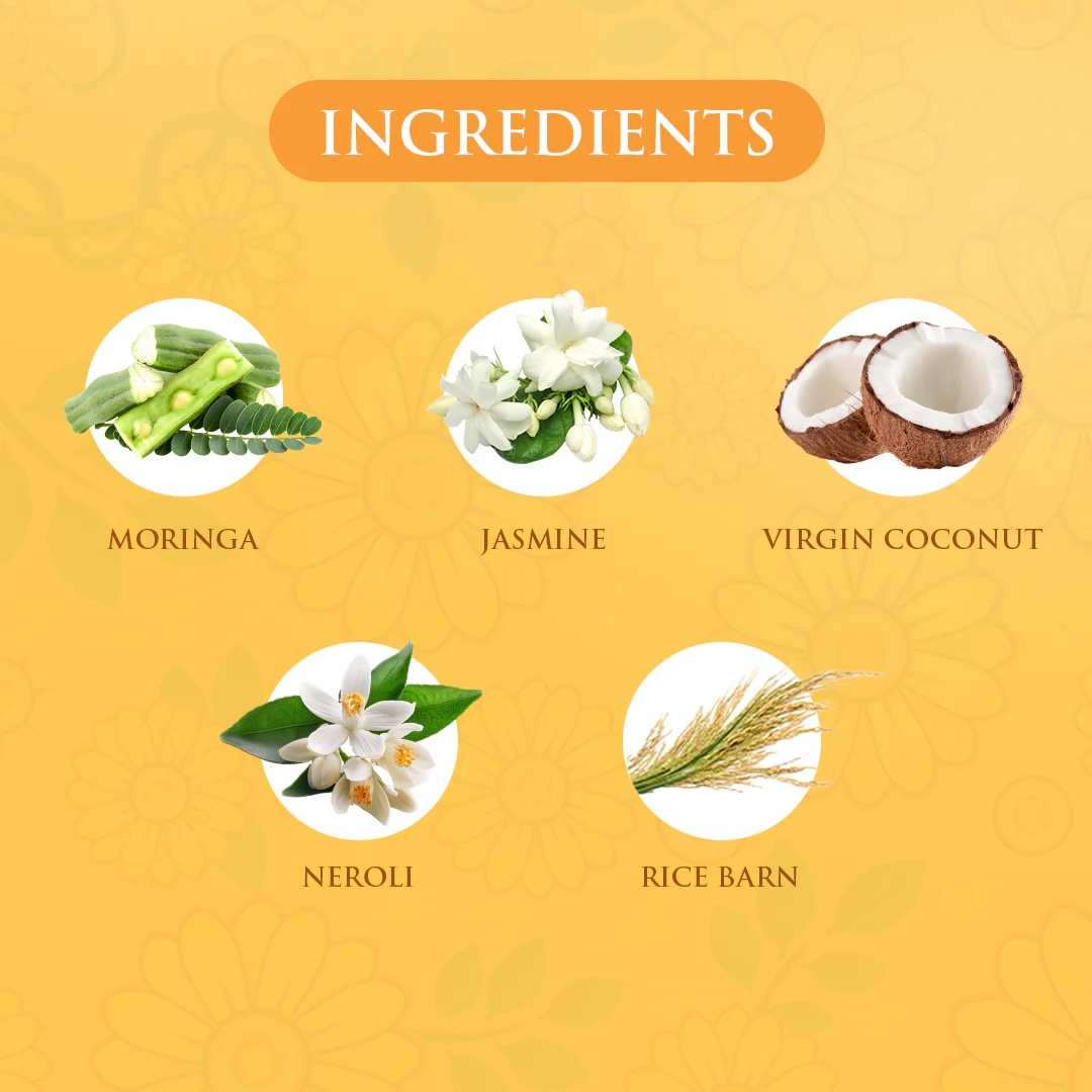 A gently calming & caring blend of herbs & essential oils to help improve skin wellness. Virgin Coconut, Wheatgerm & Sweet Almond help nourish & protect against dryness, while Moringa & Rice Bran promote more-even tone. Calming Neroli Blossom, uplifting Orange & refreshing Bergamot work in synergy with balancing Jasmine to soothe & calm the senses.